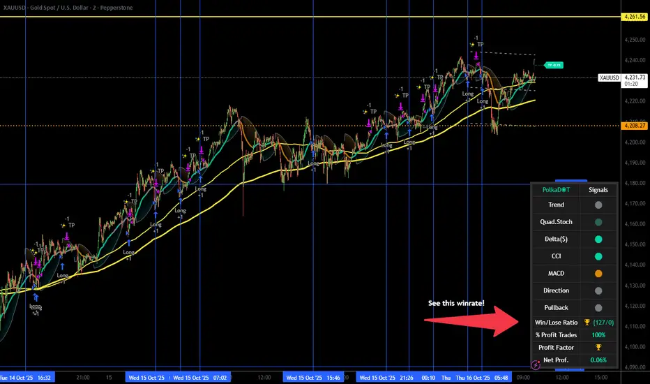 Key features include contra-reversal signals that identify potential trend reversals when price action becomes exhausted, aided by our Quad Stochastic Grid system for confirmation. The dynamic dashboard uses color-coded dots for instant signal recognition - teal for bullish, orange for bearish, with special concentric dots indicating strong confluence among multiple indicators. Delta analysis tracks real buying/selling pressure, with early buyer signals marked by a '$' symbol, particularly valuable for futures trading. Entry signals are reinforced with clear triangular markers, while our intelligent '+' system identifies optimal moments to add to winning positions.