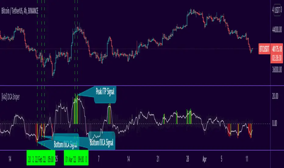 DCA Sniper is an indicator that tells you the perfect time to do DCA, the bottoms areas are indicated by red bars, the buy signal is given when a yellow bar appears.
