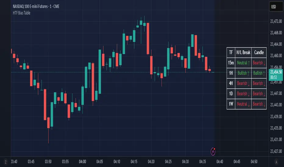 The HTF Bias Tracker is a custom indicator designed to help traders monitor higher time frame (HTF) market biases while trading on lower time frames. It provides a clear visual table displaying the bias (bullish, bearish, mixed, or neutral) based on whether the current HTF candle has broken the high or low of the previous HTF candle. Additionally, it shows the current candle's condition (bullish or bearish based on close relative to open). This tool is particularly useful for multi-timeframe analysis, allowing traders to align lower time frame entries with higher time frame trends without switching charts.
