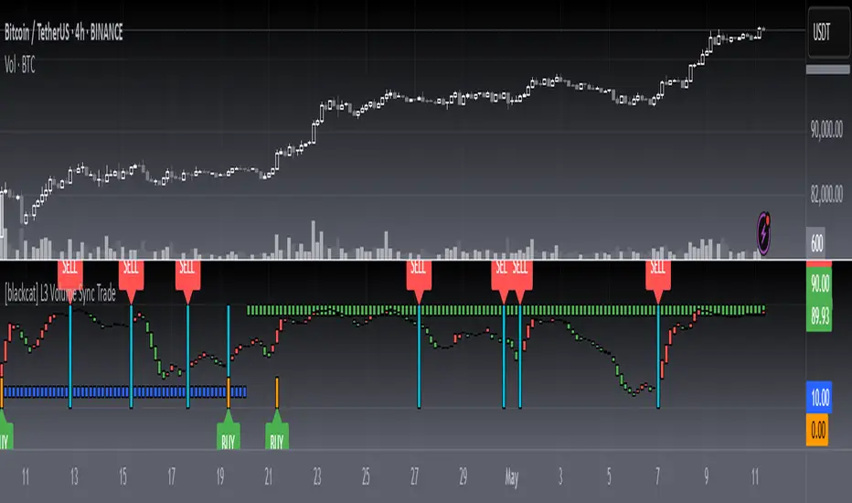 The [blackcat] L3 Volume Sync Trade indicator empowers traders 📈💹 with advanced tools to pinpoint precise entry and exit points leveraging intricate volume and price momentum analyses. By encapsulating sophisticated technical calculations into an intuitive visual format, this script aids in identifying high-probability trades while minimizing guesswork. Whether you're a seasoned trader looking to enhance your strategy or a newcomer seeking structured guidance, this indicator offers invaluable insights tailored to elevate your trading precision.