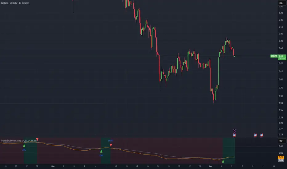 Provides a reversal signal (arrow + “LONG” or “SHORT”) when the trend changes.