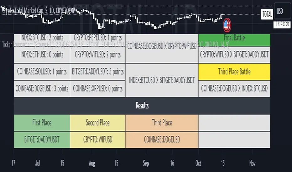 The indicator includes 8 Tickers selection and has 3 Tournament types: