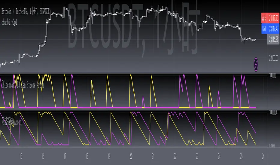Classical Aroon can also show the beginning of a new trend, its strength and expectation of changes from trade areas to trends. However, i found it contained to much noise and i was wondering how to remove this noise. Finally, I decide to use my Zen Stroke script to locate peaks and valleys firstly and then use the generated but confirmed peak and valleys to produce a new kind of Aroon indicator. It results in less signal even with smaller length parameter.