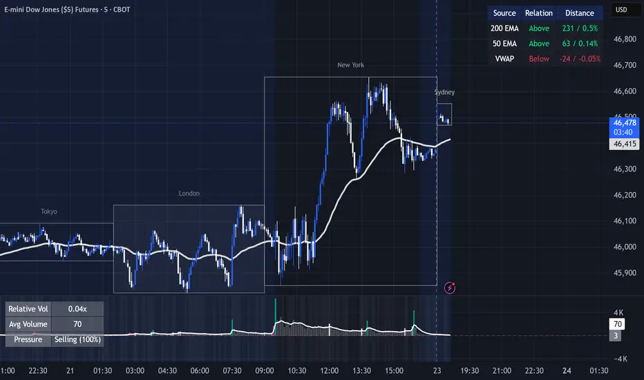 This indicator displays a compact real-time table showing where current price is trading relative to three major dynamic levels: 200 EMA, 50 EMA, and VWAP.