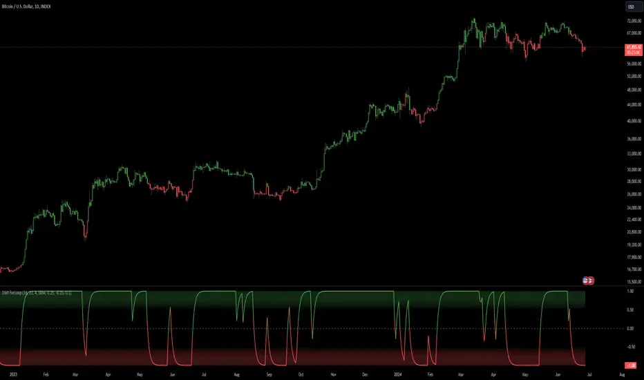 The DMI ForLoop indicator calculates an array of DMI values over a specified range of lengths, then averages these values and applies an EMA for smoothing. The result is a dynamic trend indicator that adapts to market conditions.