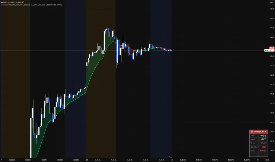 Malama's Universal Anchored M.A. (UMA+) is a highly versatile, all-in-one moving average framework that supports over 28 different calculation methods — from classic (SMA, EMA) to advanced adaptive and Ehlers-based filters (KAMA, FRAMA, MAMA/FAMA, Super Smoother, Kalman, etc.). It features an innovative Anchored Mode that resets calculations from a user-defined point (specific date/time, bars back, or the start of data), making it perfect for analyzing price action relative to key market events like earnings, FOMC news, or cycle starts.