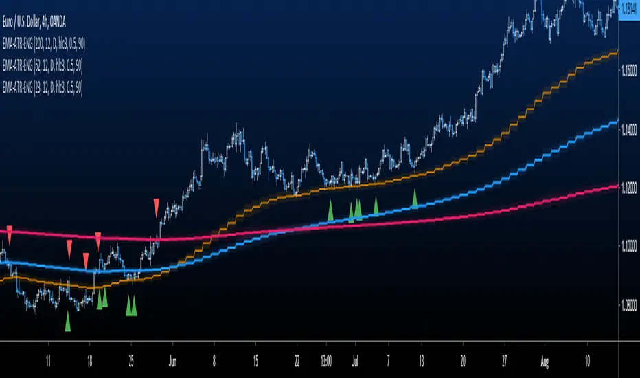 - The signal appears only if one of OHLC price point of engulfed and/or engulfing candles are within upper and lower ATR areas around EMA