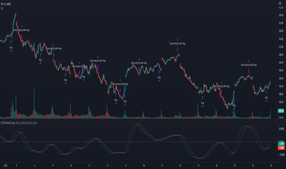 This strategy enters long when the KST line crosses over the signal line, and exits when the KST line crosses under the signal line.