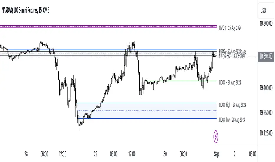 New Week Opening Gap (NWOG) and New Day Opening Gap (NDOG) are areas on the chart where price tend to react to and has the potential of moving from one gap to the next. These gaps can act as support and resistance zones where price can bounce of, or go through and retest. Areas of interest are the high, low, the Consequent Encroachment (C.E.), which is the middle between high and low of each gap.
