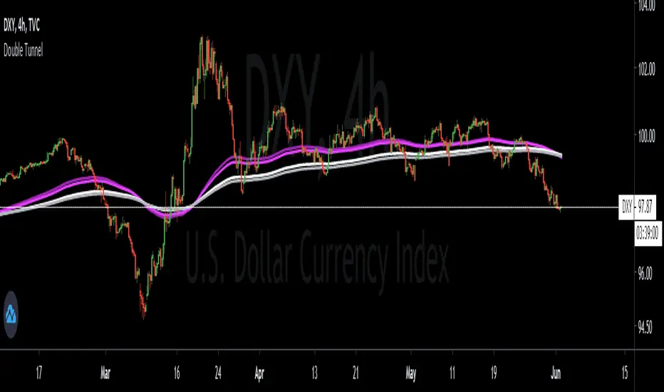 Adding another two EMA 288 338 to the classical Vegas Tunnel, which helps traders identify the relationship between major trend and moderate trend. When the space between two tunnel narrows down, it indicates the changing of the trend and potential reverse of the price. Double Tunnel offsets the limitations of Original Vegas Tunnel. Traders can corporate other moving averages with Double Tunnel. Good Luck!