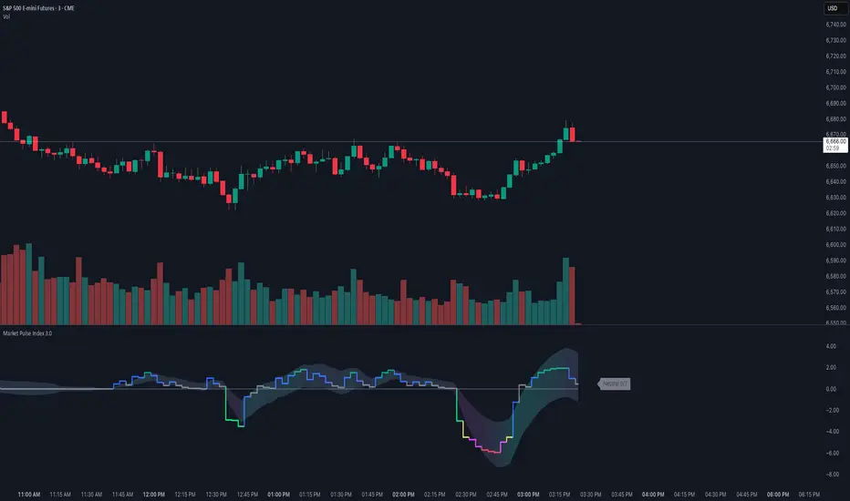 Market Pulse Index condenses intraday market breadth into a single, color-coded score from -7 to +7 on intraday timeframe charts. It analyzes gap behavior and the markets internals into a single “pulse” line with an optional adaptive envelope that reacts to session volatility.