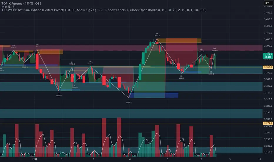 [概要] このインジケーターは、「ダウ理論」に基づくトレンド判定と、精密な「需給ゾーン(Supply/Demand)」を可視化するための市場構造分析ツールです。 遅行指標を使わず、純粋なプライスアクション(ZigZagピボット)に基づいて、機関投資家の意識する価格帯を特定します。