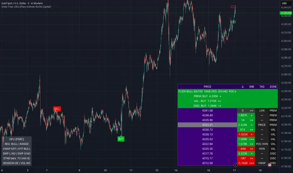 Order Flow Ultra (OFU) is a regime-aware trend-flip execution engine paired with a decision-grade order-flow ladder. It’s designed for 3m/5m execution on liquid instruments where micro-structure matters (XAUUSD, NAS100, BTC, EURUSD/GBPUSD), while staying aligned with institutional positioning logic (HTF bias, VWAP location, sweep→displacement confirmation, session context).