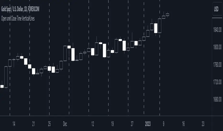 Marks vertical lines for open and close times on any time frame. Go to settings to change the time frame, color, and width.