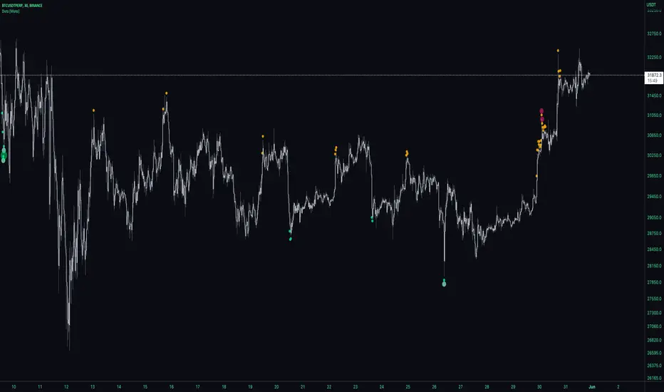 This indicator has three identical but lookback specific indicators, small dot, medium dot, large dot, with specific colors, as well as another low and high dot placement with a different metric. I needed a way to gauge how large of a position size to put on each pivot point , this makes it self explanatory. Regardless of time frame, largest entries should be on candles with dots stacked up, large, and most extreme. Reddish pink for shorts, greenish for longs. I'm still backtesting this and will more than likely post updates as I go. This was designed for low time frames, 15 minutes and under, but can certainly still work on higher time frames. Blue and red dots are essentially calling longer time frames and apply a filter, so should be respectful for higher time frames. Small dots are warnings, larger dots should be respected more so. Be aware of strong trends when the dots will appear as counter to successful trend.