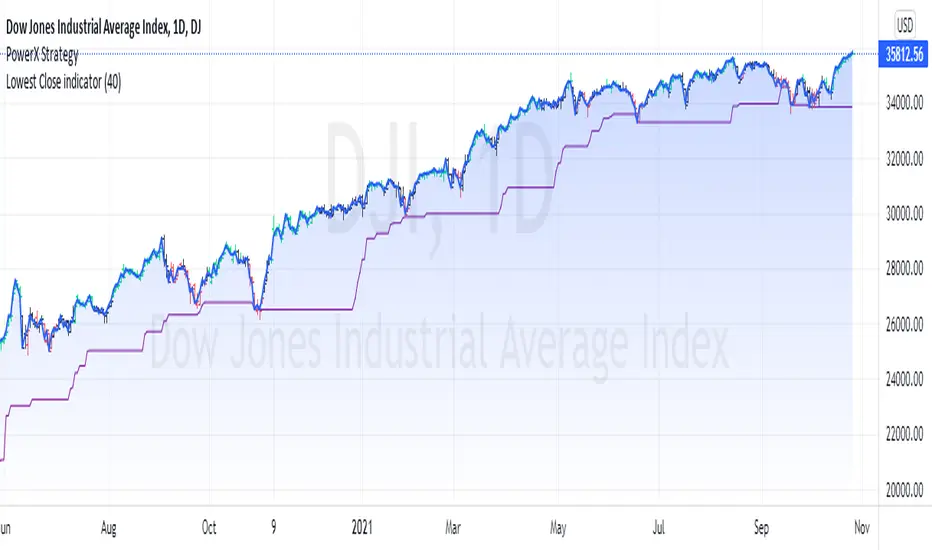 Plots the lowest close in last 40 bars. On a daily chart , that's about 8 weeks.