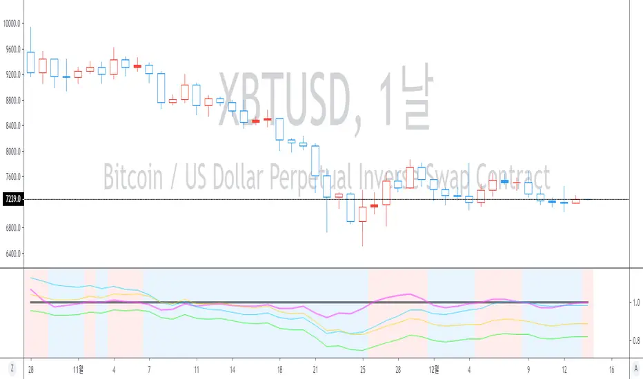 Color line goes upward crosses horizontal line ("1"), you can consider buy price.