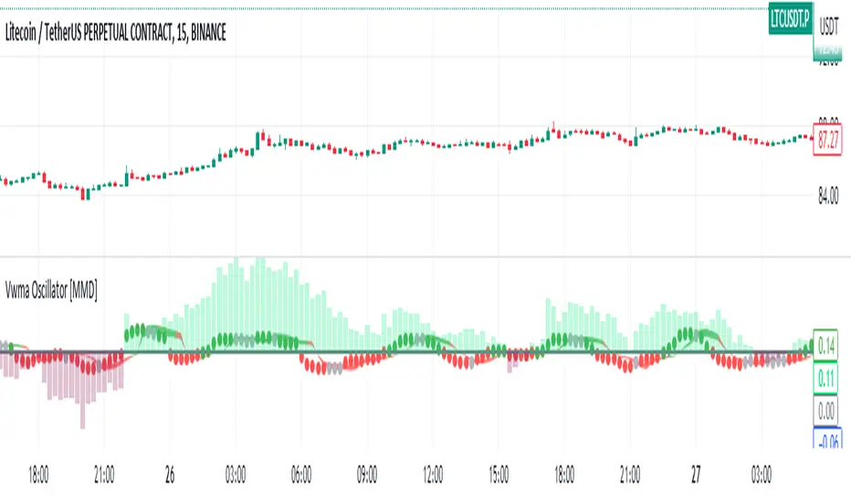 This line calculates the difference between the value of a1 and the volume-weighted moving average (VWMA) of the close price. The VWMA is calculated over a period of 8 bars.