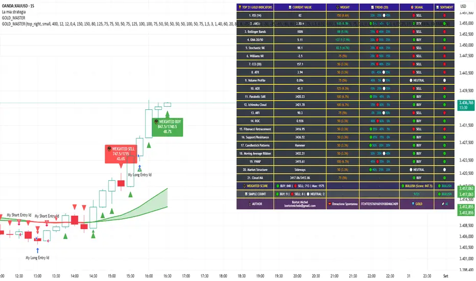 Core Purpose: Advanced Pine Script indicator that analyzes 20 technical indicators simultaneously for XAUUSD (Gold) trading, generating automated buy/sell signals through a sophisticated scoring system.