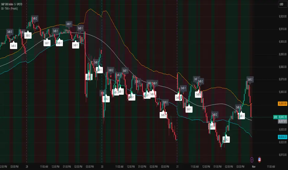 Adaptive outer bands act as over-extension or “take-profit” zones — similar to ATR channels but smoothed for consistency.
