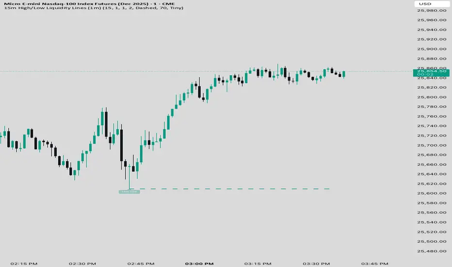 It provides a clean, automated method to track active 15-minute liquidity levels directly on the 1-minute chart with zero clutter and perfect alignment.