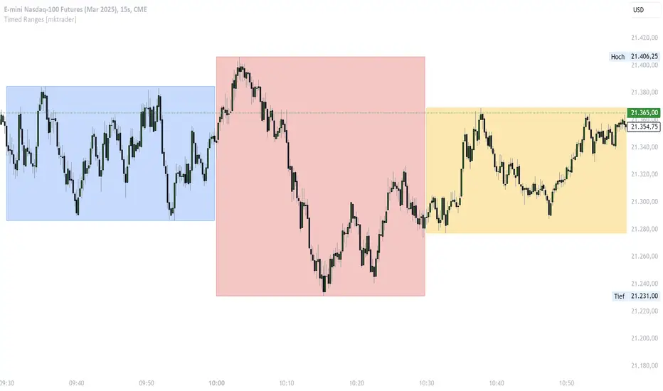 The Timed Ranges indicator helps visualize price ranges that develop during specific time periods. It's particularly useful for analyzing market behavior in instruments like NASDAQ, S&P 500, and Dow Jones, which often show reactions to sweeps of previous ranges and form reversals.### Key Features