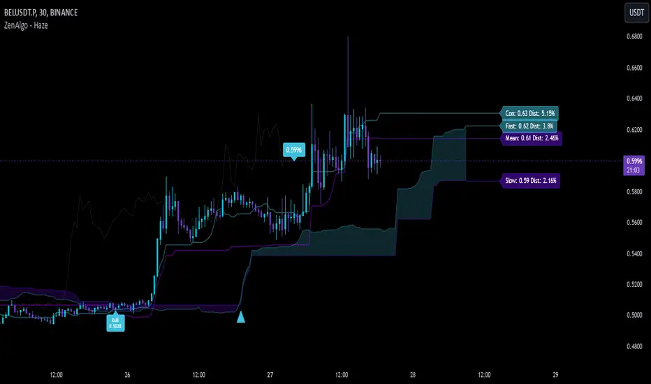 The Haze indicator is designed to be intuitive yet comprehensive, offering multiple layers of analysis to guide traders. Here's how to interpret its outputs effectively: