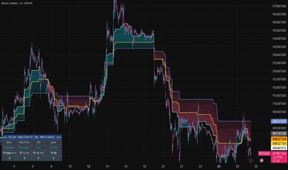 Kijun Equilibria v3.0 [by Oberlunar] is an equilibrium-based indicator that builds a multi-timeframe “Kijun cloud” and adds a mean-reversion (pullback) detector on top of it. The equilibrium line can be computed using Adaptive Envelope, Ichimoku Midrange, KAMA, HMA, EMA, or SMA. The script calculates the selected equilibrium on the chart timeframe and on three additional user-selected timeframes, then uses the highest and lowest equilibrium values to form a cloud that highlights where timeframes disagree (dispersion) and where they compress into a tighter balance zone.