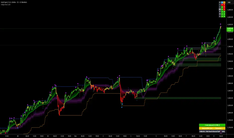 Indiprime is a lightweight trend analyzer that identifies market direction and phase while now including Demand/Supply zones calculated using ATR and Pivot Points.