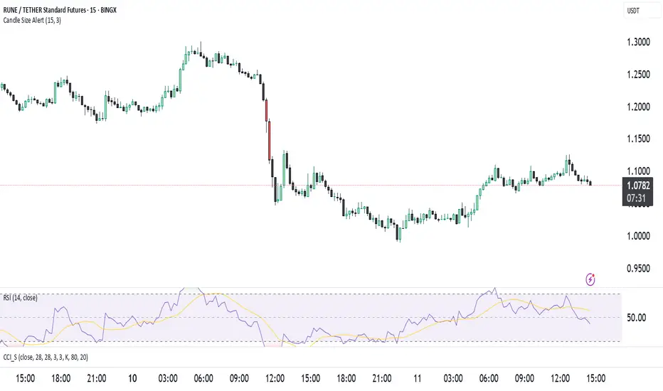 This indicator detects large candles by calculating the average size of the last 10 candles. If the current candle is 3 times larger than the average of the previous candles, a warning label appears above the candle. Additionally, automated alerts can be triggered using alertcondition().