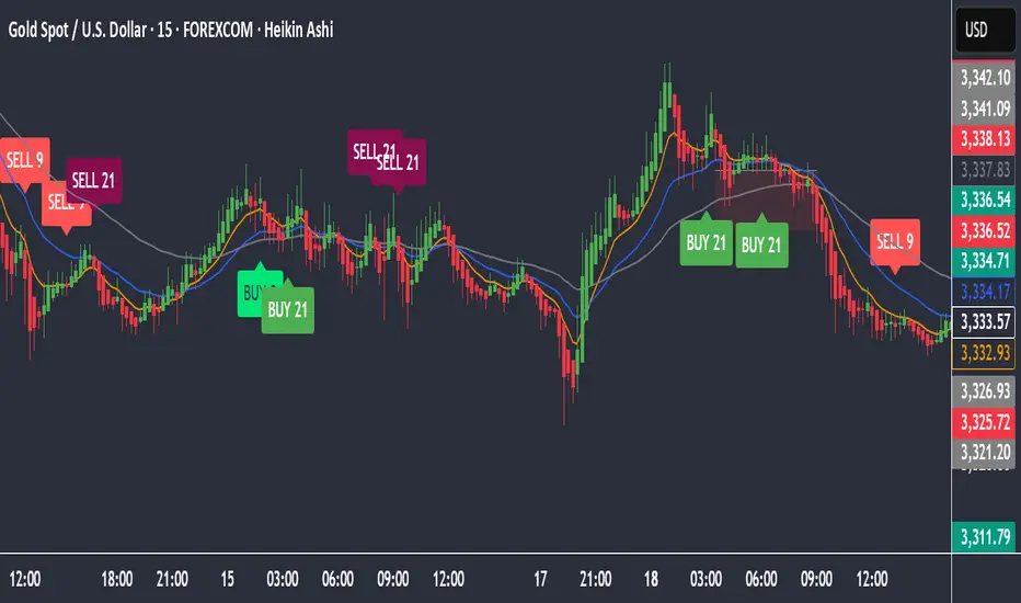 Trend alignment signals using 3 EMA's. pre-code written parameters must all be met to throw a signal out. Works best with Heiken ashi candles. Works on Gold, Nas100, S&P 500 and US30