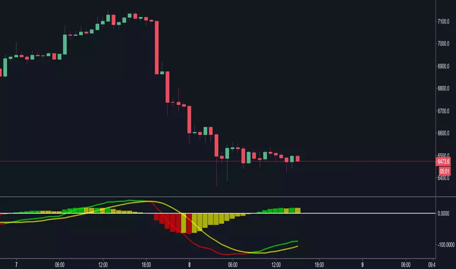Example: Upticking (Green) histogram begins to downtick, turns Yellow. Downticking (Red) histogram begins to uptick, turns Yellow as well.