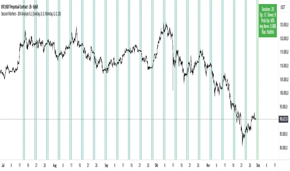 Updated Version: The upcoming session is now highlighted as well. Its color reflects the current bias, which is calculated from the last N historical sessions, so you can see at a glance whether the next session is statistically more likely to be bullish, bearish, or neutral.