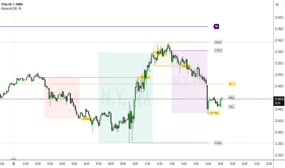 Indicatore avanzato per Pine Script v5 progettato per strategie ICT (Inner Circle Trader) che identifica killzones di trading, livelli chiave di supporto/resistenza e prezzi di mezzanotte con controlli granulari per ogni elemento.
