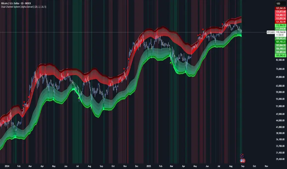This indicator delivers sophisticated channel-based market analysis through volatility-adaptive ATR calculations and intelligent zone construction methodology. By combining dynamic support and resistance detection with advanced signal generation and comprehensive visual mapping, it provides institutional-grade channel analysis suitable for cryptocurrency, forex, and equity markets. The system's ability to adapt to varying volatility conditions while maintaining signal accuracy makes it essential for traders seeking systematic approaches to breakout trading, zone reversals, and trend continuation analysis with clearly defined risk parameters and comprehensive alert integration. Also to note, this indicator is best suited for the 1D timeframe.