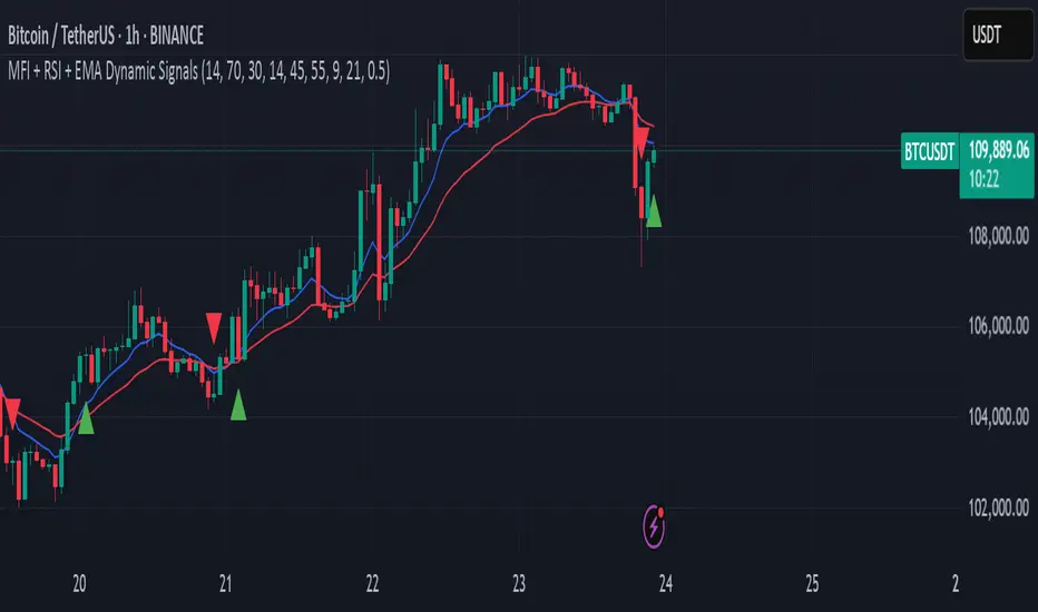 The MFI + RSI + EMA Dynamic Signals is a designed to combine with widened criteria to capture more trading opportunities, it balances momentum, trend, and flexibility, making it suitable for trading on timeframes like 15-minute to 4-hour charts.