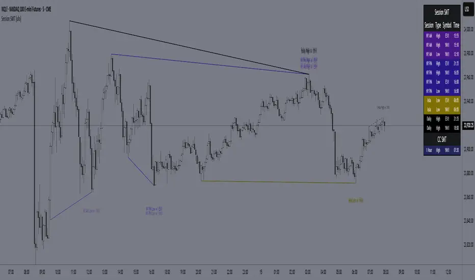 Unlike basic divergence tools, this indicator is built specifically for Session-Based and Timeframe-Based SMT tracking. It continuously monitors intraday sessions and higher timeframes, then plots divergences the moment they occur.