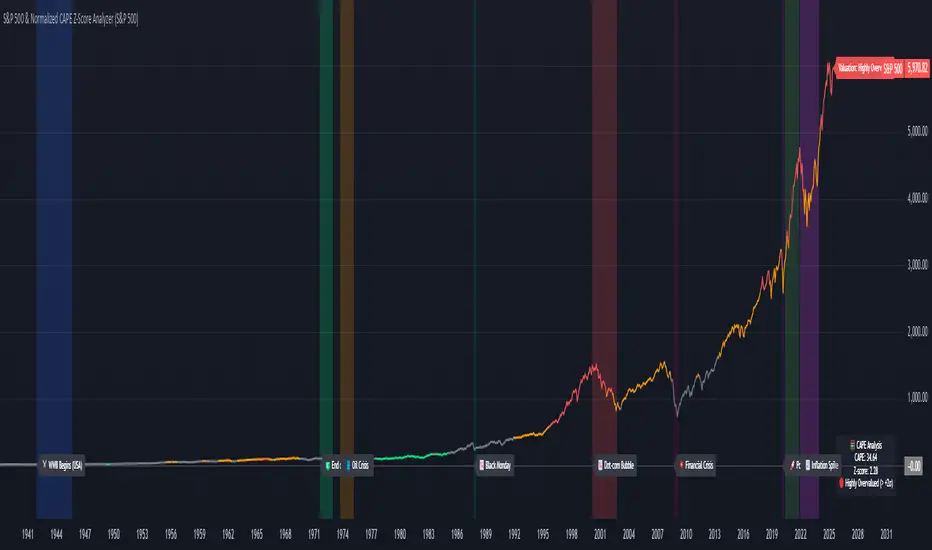 This indicator is ideal for macro traders and long-term investors looking to contextualize equity valuations across decades. It helps identify statistical extremes in valuation by referencing the standard deviation of the CAPE ratio relative to its long-term mean. The overlay of S&P 500 price with valuation zones provides a visual confirmation tool for macro decisions or timing insights.
