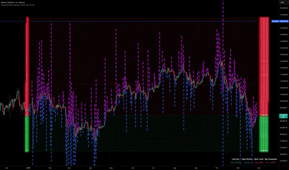 Grid trading involves significant risk, particularly in strong trending markets that break out of your range against your position. This strategy does not use a stop-loss per trade; it relies on the user defining a safe "Bottom Price" and allocating capital accordingly. Past performance in backtesting does not guarantee future results. This script is a tool for execution and analysis, not financial advice.