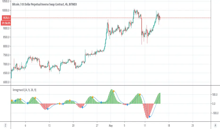 crossing up or down of macd and signal shown by + either blue=up , down=orange