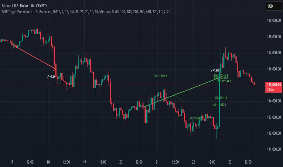 MTF Target Prediction Enhanced is an advanced multi-timeframe technical analysis indicator that identifies and clusters target price levels based on trendline breakouts across multiple timeframes. The indicator uses sophisticated clustering algorithms to group similar price targets and provides visual feedback through dynamic arrows, cluster boxes, and detailed statistics.