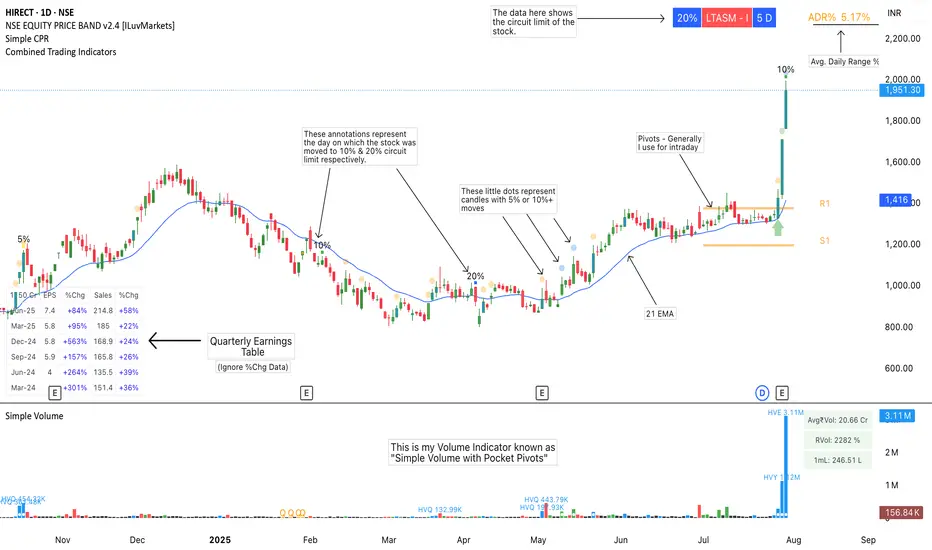 This indicator is a combination of EMAs (4 Editable EMAs), Quarterly Earnings, OOPs Reversal day, Burst Power Indicator, RS Rating, ADR% Settings and a few more to come.