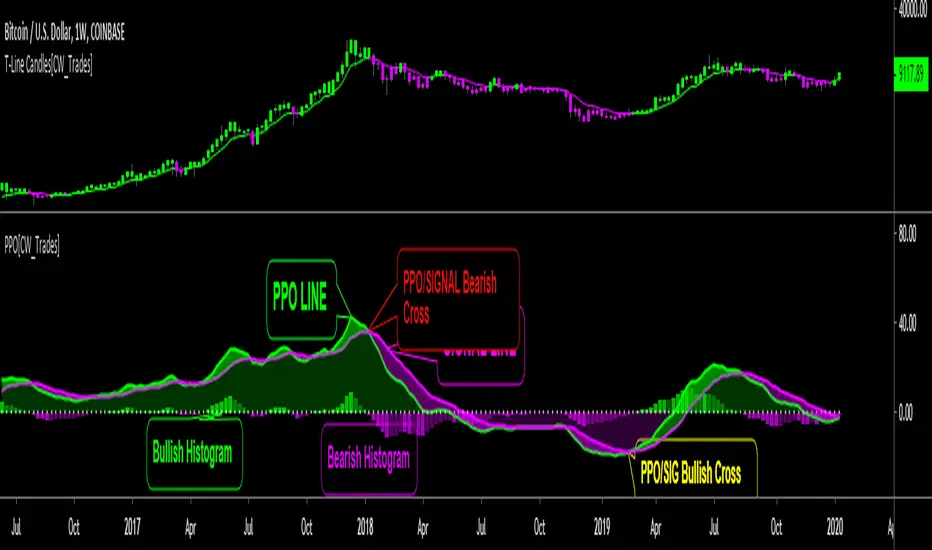 This PPO indicator retains standard PPO settings. Additions to this indicator are: 1) filling the space between the PPO LINE and SIGNAL LINE. Space is green when PPO is above SIGNAL, purple when PPO is below SIGNAL. The color of the space between PPO and SIGNAL is used to define short-term momentum for price(green is positive momentum, pink is negative momentum). 2) filling the space between the PPO LINE and CENTER LINE(0 LEVEL). This space is filled green when the PPO is above the CENTER LINE and pink when the PPO is below the CENTER LINE. Green in this area indicates positive momentum in the intermediate-term while pink indicates negative momentum in the intermediate-term.