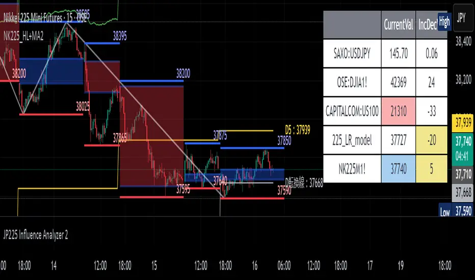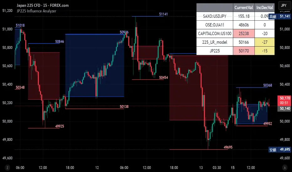 This tool provides a way to assess how USDJPY and DJIA influence JP225, using standardization and linear regression for quantitative evaluation. It also detects deviations from the linear model and displays the results in a colored table.