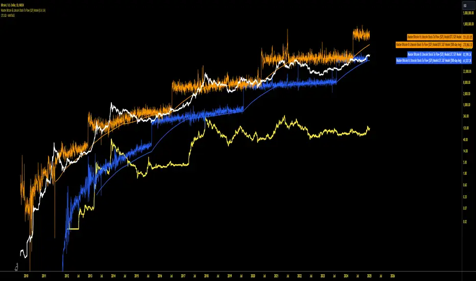 This indicator visualizes the Stock-to-Flow (S2F) models for Bitcoin (BTC) and Litecoin (LTC) based on Plan B's methodology. It calculates S2F and projects price models for both assets, incorporating daily changes in circulating supply. The script is designed exclusively for daily timeframes.