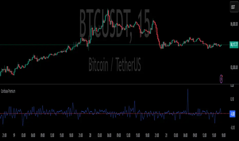 This Pine Script indicator displays the premium on Coinbase relative to the current ticker, if the ticker is available on Coinbase. It calculates the premium as the percentage difference between the price of the current ticker and the price on Coinbase.