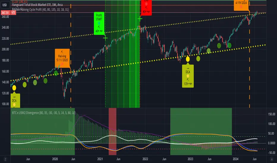 The "M2 Money Supply vs BTC Divergence with Normalized RSI" indicator integrates macroeconomic data with technical analysis to offer a comprehensive view of Bitcoin's market conditions. By analyzing the divergence between M2 money supply and Bitcoin prices, normalizing and smoothing the data, and incorporating RSI for momentum confirmation, the indicator provides robust signals for identifying potential buying and selling opportunities. This holistic approach increases the likelihood of capturing significant market movements and making informed trading decisions.
