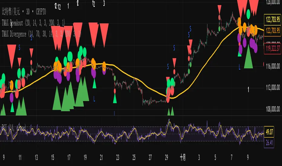TMAX Divergence is an RSI-based divergence detection indicator developed by EricFreeman, designed to identify early reversal signals in the market.