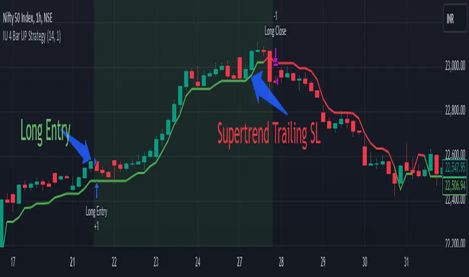 The IU 4 Bar UP Strategy is a trend-following strategy designed to identify and execute long trades during strong bullish momentum, combined with confirmation from the SuperTrend indicator. This strategy is suitable for traders aiming to capitalize on sustained upward market movements.