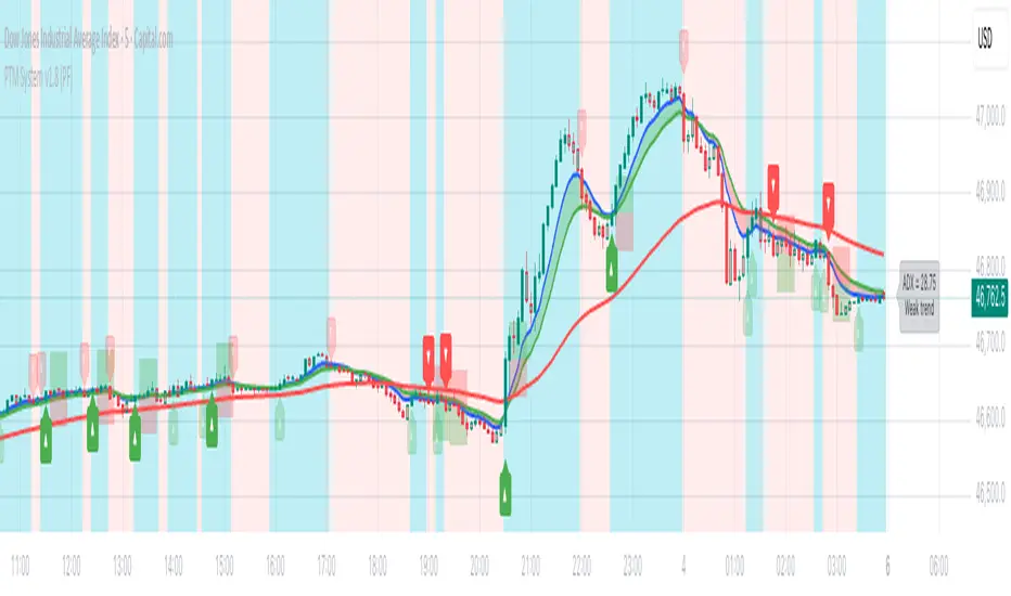 The PTM System Indicator is a powerful and comprehensive technical analysis tool designed to help traders make confident and effective trading decisions. By integrating multiple analysis strategies, the PTM System focuses on identifying clear market trends, filtering out noise, and presenting information in an easy-to-understand format, ensuring you don't miss critical market opportunities.